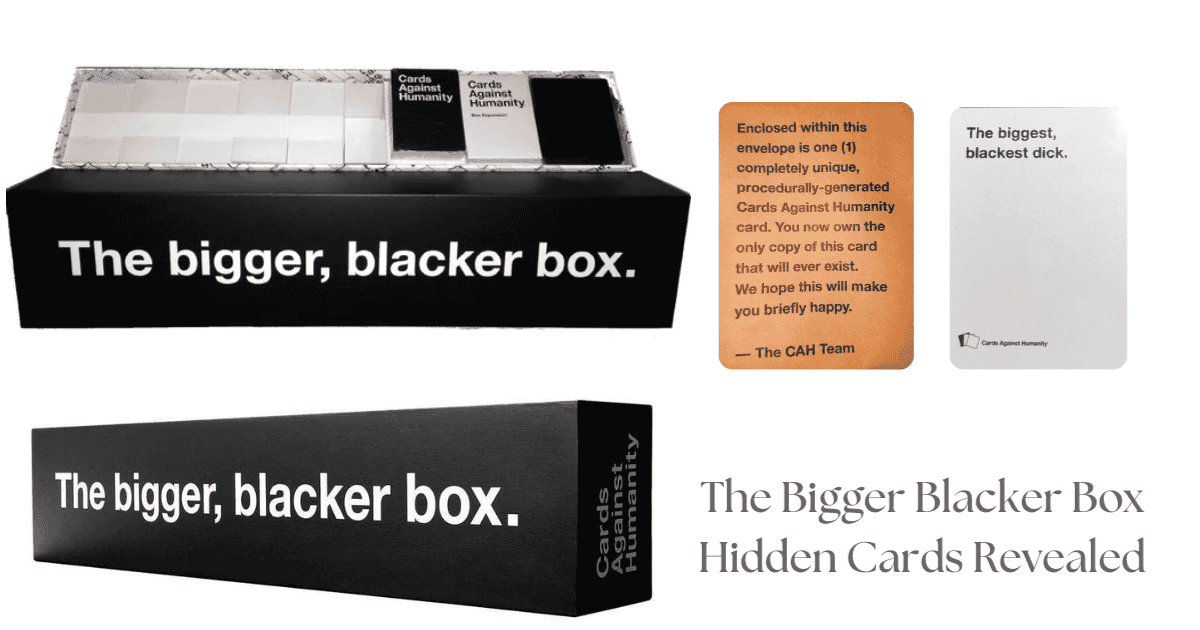 - The Bigger Blacker Box (BBB) was released first in 2013 by Cards Against Humanity, but it’s a discontinued product now.
