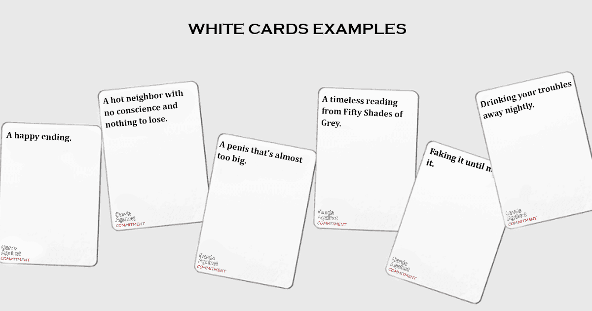 Cards Against Commitment, or Cards Against Humanity for Couples Edition, could be played in double dates or with a group of people who love talking about relationships and all the things that come with them. However, make sure that you’re comfortable with whoever you’re playing. The game, just like most of the CAH packs, is made for ages 17 and up, because of the adult language used, some of which can be read in the cards below.